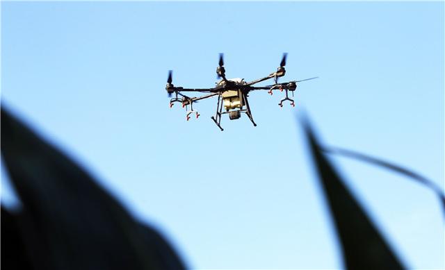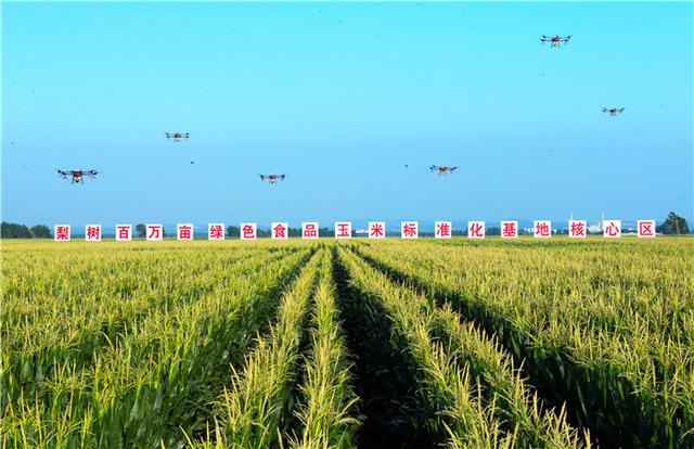 陽光燦爛,晴空萬里。一望無際的玉米抽穗揚花,十余架植保無人機盤旋作業。站在田邊的高臺上眺望,希望的田野上生機無限。 |