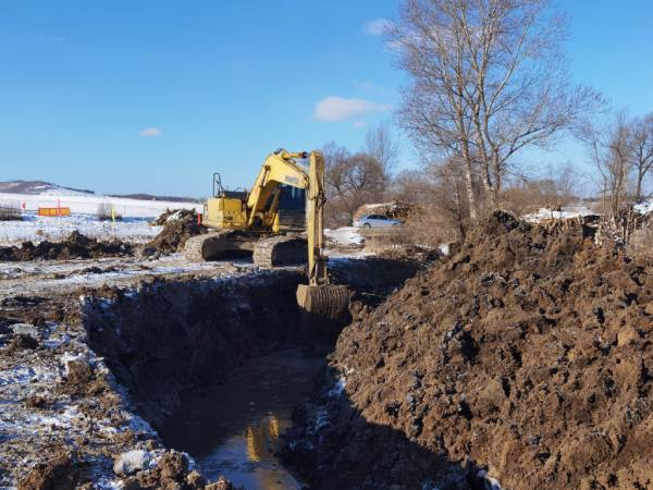 11月29日上午,東遼縣室外溫度達到零下13℃,但是高標準農田建設施工正火熱進行。在建安鎮4標段東壁村的施工現場,挖掘機傳出隆隆聲響,工人們在河溝中破冰施工,將裝好的石籠網箱按照要求埋入河底。