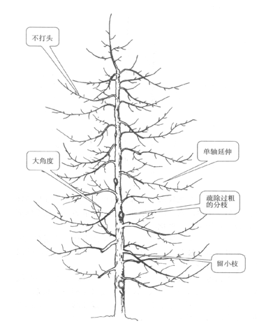 主干型的定義:凡是圍繞主干一級枝結果的樹形都稱為主干型。它包括紡錘形、自由紡錘形、細長紡錘形。主干型優(yōu)點是:修剪量輕,枝條級次少;成形和結果早;樹冠通風透光好;管理方便;產量高,果實品質好;便于機器化作業(yè)。 (一)適宜區(qū)域 蘋果、梨、桃、櫻桃等果樹種植區(qū)域。 (二)技術要點 1.樹體結構 干高80-100 cm,樹高300 cm左右,冠徑100-50cm。中心干直立強健,其上均勻著生30-35個主枝,呈螺旋狀排列,同側主枝間距20-25cm左右;主枝角度90o-120o,主枝單軸延伸不留側枝,直接著生結果枝組;枝干比小于1:3,下層主枝較大,向上依次減小,樹冠呈細長紡錘狀。 適宜于1-1.5 m × 3 m株行距。 2.整形修剪方法 (1)定干 定干高度60-80 cm。萌芽后,隨時抹除苗干上距地面60 cm的萌芽,當新稍長到50-60 cm時,用塑料條將其拉到120度左右。并注意培養(yǎng)強健中心干 。 (2)促萌 春季萌芽前,在整形帶內每隔2-3芽螺旋狀進行刻芽或涂抹發(fā)枝素,萌芽后10 d內對不發(fā)枝部位進行2次刻芽或選擇其它適宜發(fā)枝部位進行刻芽或涂抹發(fā)枝素。 (3)扶壯中心干延長枝 5月中、下旬,在定干剪口下選擇直立健壯的新梢為中心干延長枝,疏除其下2-3個競爭性新梢,生長季對中心干延長枝進行直立綁縛。頂端新梢過弱的樹,疏除弱梢,讓下部壯梢當頭,然后參照正常樹管理。 (4)拉枝開角 當中心干上側生新梢長到40-60cm時,一般在六月下旬至七月上旬開始扭枝、頂部摘心去葉、開張角度,使其角度在90-120°。后期注意對新梢延長頭進行角度控制,直至秋梢停長。 (5)疏梢除萌 定植當年萌芽后,疏除中心干上距地面60cm內的分枝;生長季疏除主枝基部因拉枝開角萌發(fā)的新梢。 (6)中心干延長枝修剪 第2年選取飽滿芽處短截中心干延長枝,一般剪留長度60 -80 cm,生長勢強的品種如金紅蘋果(123)、雞心果可適當長些;剪口處涂抹愈合劑。第3年繼續(xù)對中心干延長枝進行短截,剪留長度60-80 cm,第4年如達到樹高要求,不再短截。 (7)主枝修剪 疏除中心干上枝干比> 1/4分枝和長度> 80 cm的分枝。疏除時留馬蹄形斜剪口,剪口處涂抹愈合劑。對上年拉枝角度不到位或枝頭上翹的分枝進行軟化拉枝。在中心干延長枝和剪留分枝(長度> 50 cm)整形帶內進行刻芽或涂抹發(fā)枝素,促進萌芽。疏除著生在2-3年生主枝上的背上枝、距主枝基部10 cm內的枝條、延長頭的競爭枝。全樹留主枝30-35個。 (8)生長季修剪 定植第2年,開花期疏除所有花序,不留果。疏除中心干上剪口處的并生梢、過密梢及中心干上距地面80 cm內的分枝。疏除2年生主枝上的延長頭競爭枝。2年生主枝背上新梢長至15-20 cm時在基部進行低位扭梢,斜上生長新梢長至40-60 cm時進行轉枝或軟化拉平。依據樹體長勢,對長勢較旺的側生新梢進行摘心去葉,新梢每長至40-60 cm進行摘心并剪除生長點下3-5片葉片,保留葉柄,生長季摘心2-3次。