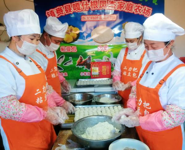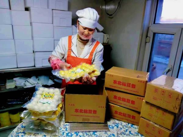 西屋灶臺里柴火正旺,徐云忠妻子王鳳杰圍著大鍋煮豆子;東屋車間里,這邊十幾名工人動作麻利地搗豆餡、包豆包......場面熱鬧而溫馨;那邊十層高的籠屜整齊碼在蒸箱里,時間一到,熱乎乎、香噴噴、黃燦燦的東北黏豆包“閃亮”出爐。經過案臺上挑揀、包裝等工序后,一袋袋、一箱箱包裝精致的小豆包開始了“暢銷之旅”。線上、線下闖市場:通過快手、抖音等平臺上的直播帶貨、線上包郵,遠銷到浙江省、黑龍江省和天津等30個地區;線下在周邊縣、鄉共設立近20個代銷點。