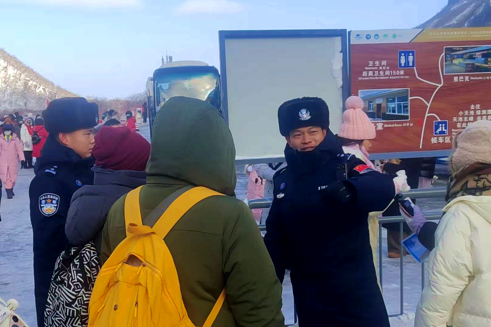“請(qǐng)不要擁擠,有序排隊(duì)。”執(zhí)勤民警在景區(qū)換乘中心等人員密集場(chǎng)所,加大工作力度,提醒游客注意人身安全。民警重點(diǎn)對(duì)景區(qū)內(nèi)冰雪娛樂(lè)設(shè)施開(kāi)展全面排查,逐一核查設(shè)備牢固度、安全警示標(biāo)識(shí)設(shè)置情況,反復(fù)叮囑工作人員嚴(yán)格落實(shí)安全防護(hù)措施,從源頭杜絕意外事故發(fā)生。
