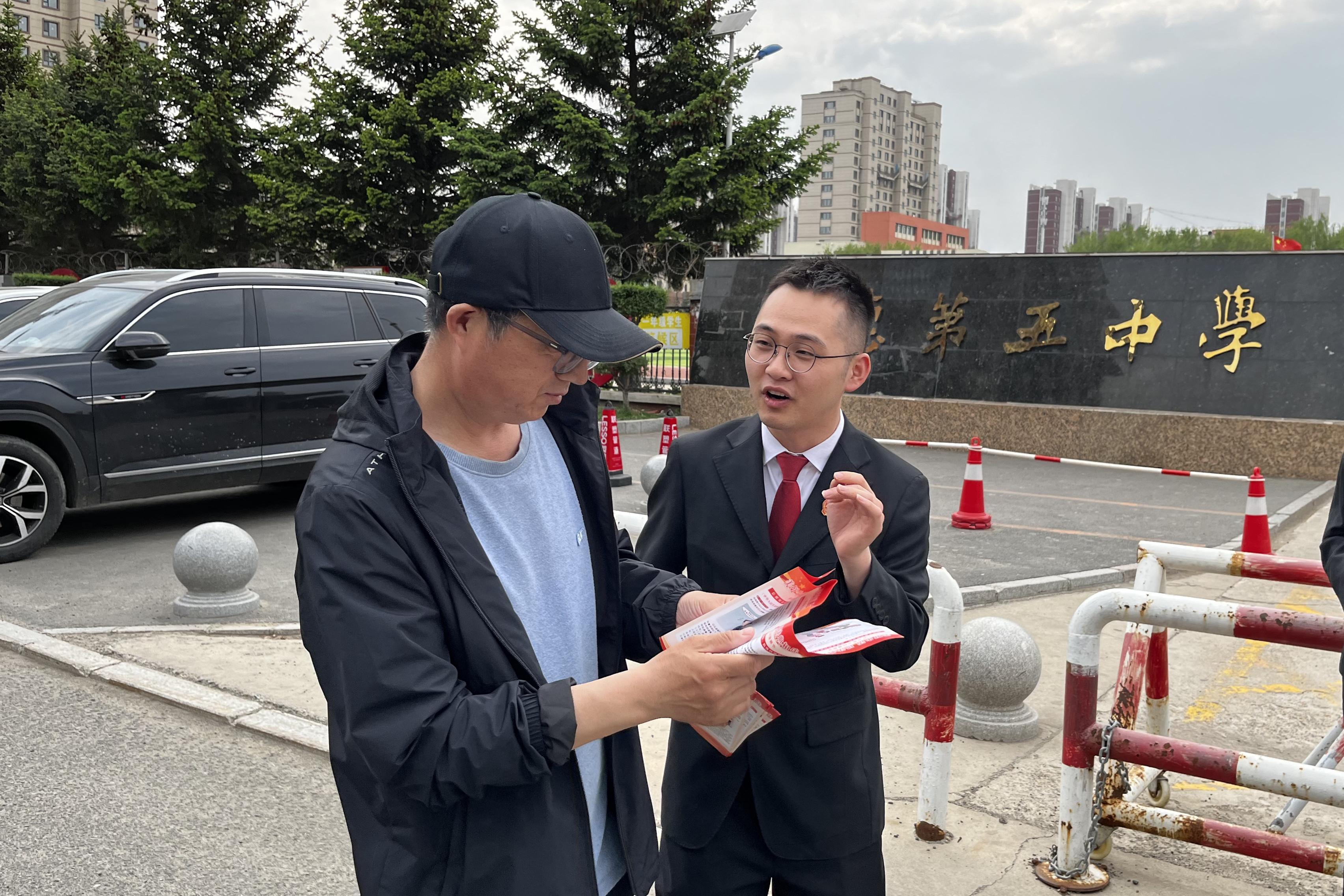活動當天,干警們身著制服,手持精心制作的宣傳彩頁,面帶微笑地向過往家長發放資料。干警不僅對過往家長進行《中華人民共和國民法典》法律條文解讀,還結合校園貸詐騙、網絡暴力、性侵害等青少年常見法律問題,通過典型案例以案釋法,用通俗易懂的語言將法律知識送到家長手中,并對家長們提出的各類法律困惑一一解答。