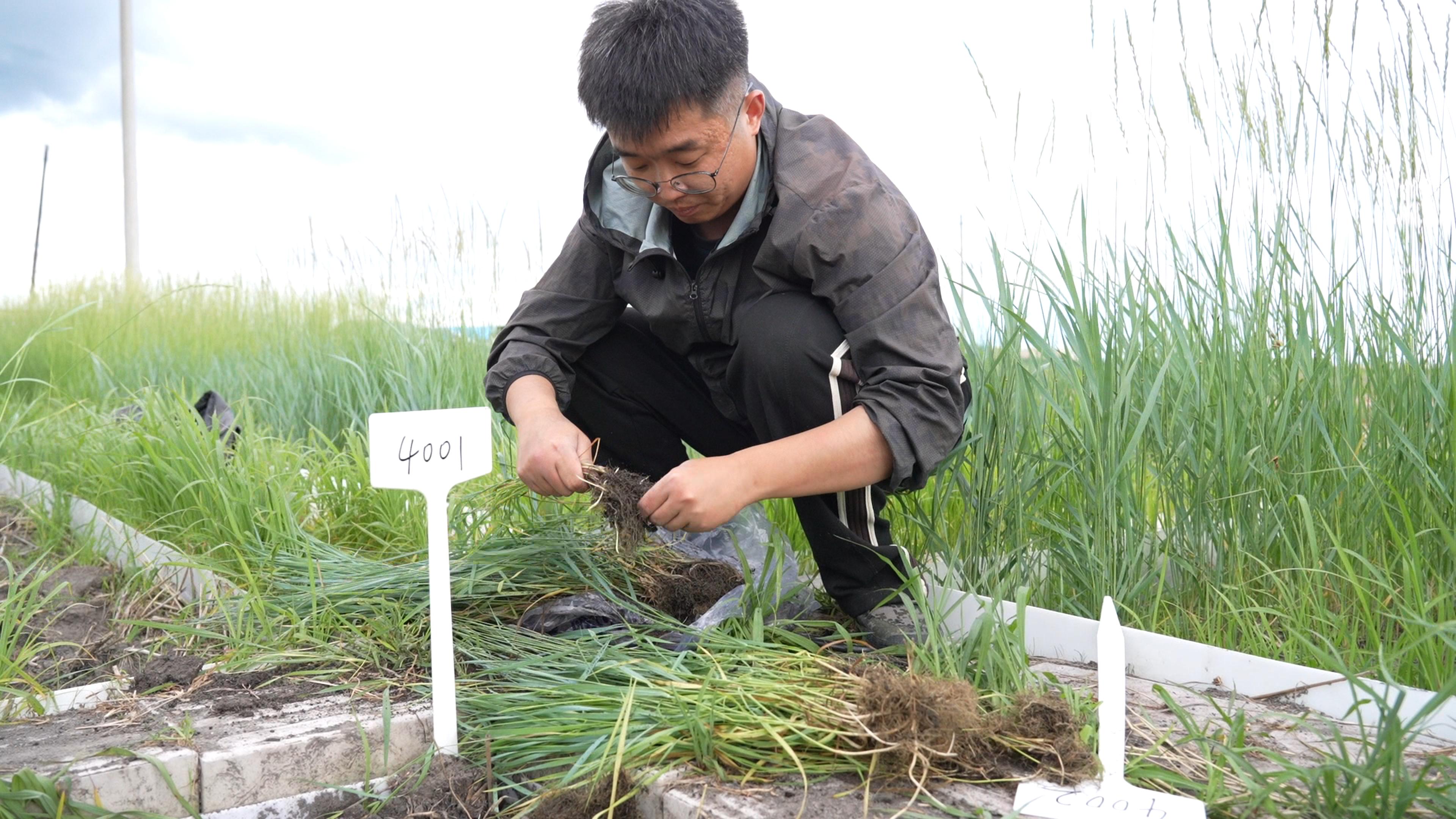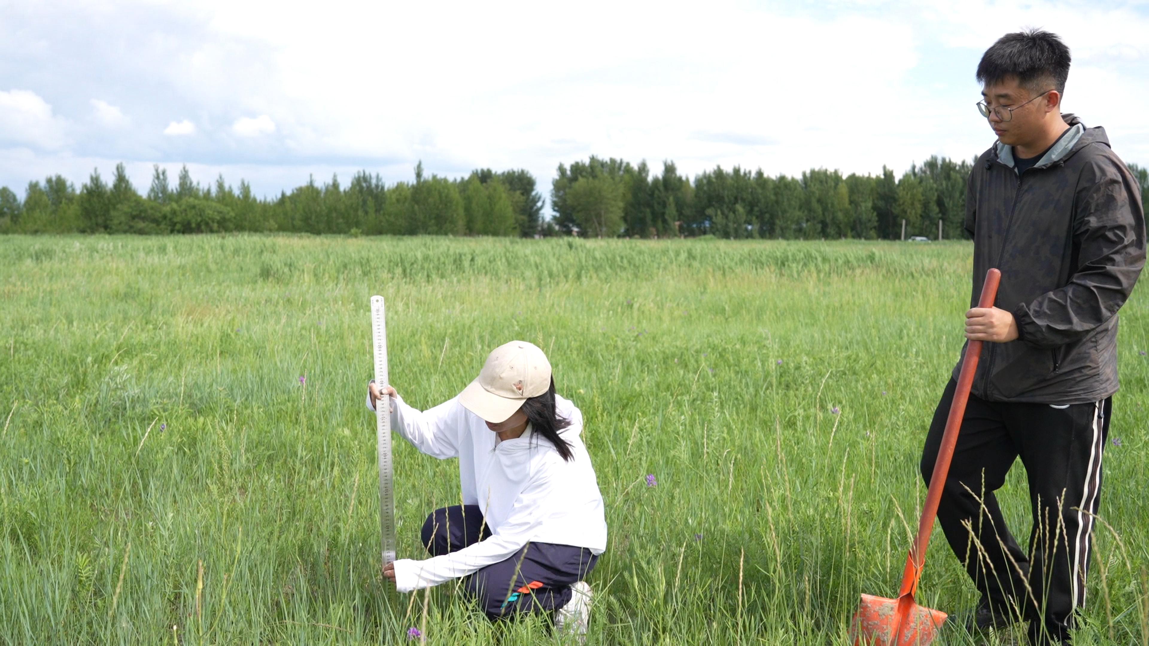 在白城市洮北區青山草場,科研人員頂著烈日,穿梭在茫茫草原上,篩選野生羊草種質資源。她們仔細查看羊草的長勢,測量株高、穗長,小心翼翼地將性狀表現優良的野生羊草挖出,輕輕去除根部土壤,認真查看根系狀況,隨后裝入袋中。每一個動作都充滿了專注與嚴謹,彰顯著對科研事業的執著與熱愛。 “你看這是羊草地下橫走的根莖,根莖最頂端的芽非常堅硬,它像一個先鋒,橫著向前生長,每生長一段根莖就會有一個芽點,芽點上就會長出新的羊草苗,然后它繼續往前走,再長出來,可以長到幾米長,這就是羊草的無性繁殖。”中國科學院東北地理與農業生態研究所研究員馬紅媛手中拿著一束羊草樣本在向記者介紹,“羊草的生命力非常頑強,地下根莖非常茂盛,可以起到快速擴繁防風固沙作用。”
