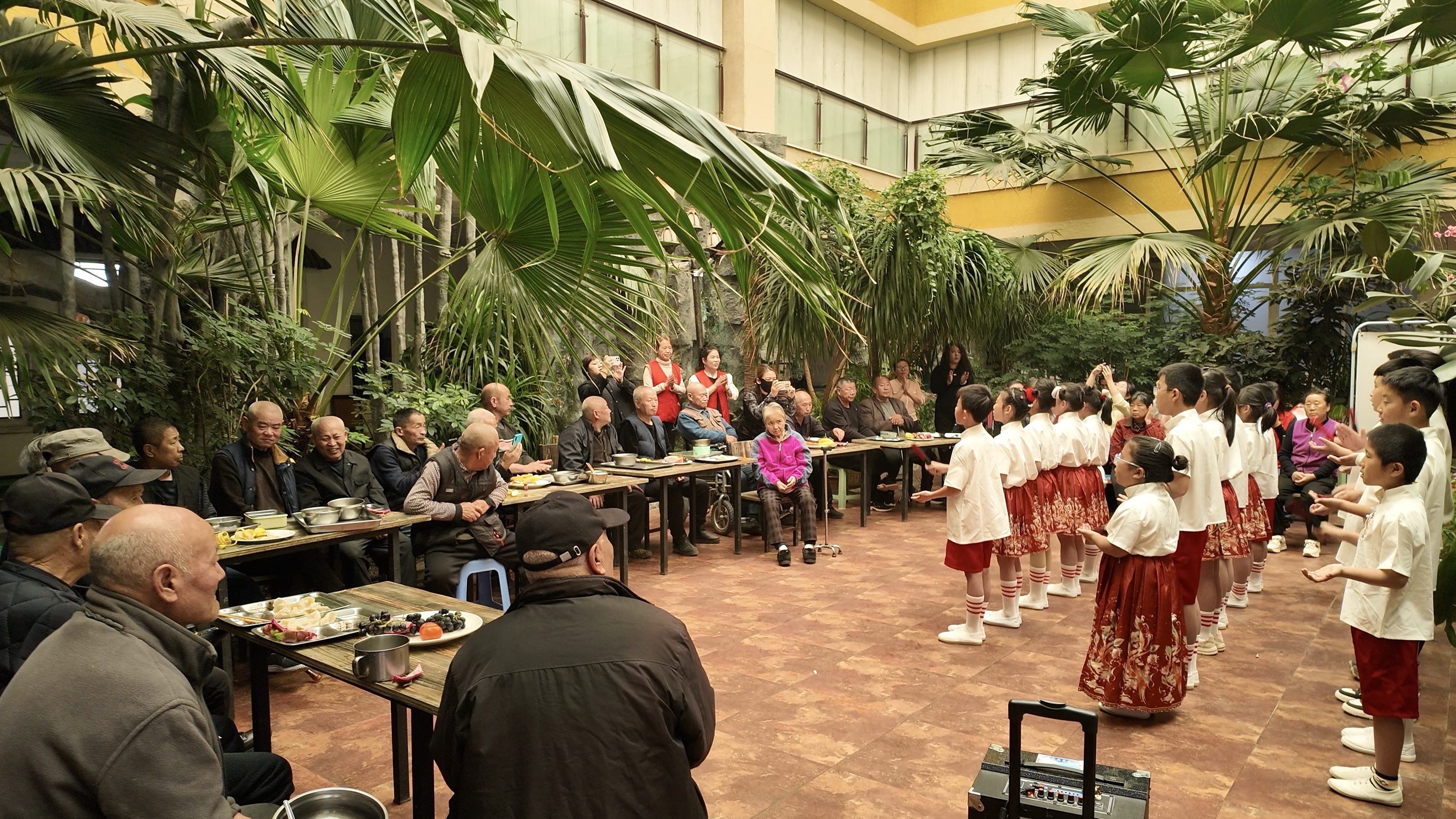 活動現(xiàn)場,志愿者們分工有序,有的清洗食材、調制餡料、搟皮包餃,有的負責清洗分裝水果。不一會兒,飽滿的餃子就擺滿餐盤,水果也整齊裝盤,現(xiàn)場洋溢著溫馨的氣氛。隨著餃子下鍋,平安川明德小學的小朋友們獻上了合唱、舞蹈等節(jié)目,用純真的表演贏得老人們陣陣掌聲,場面溫馨動人。