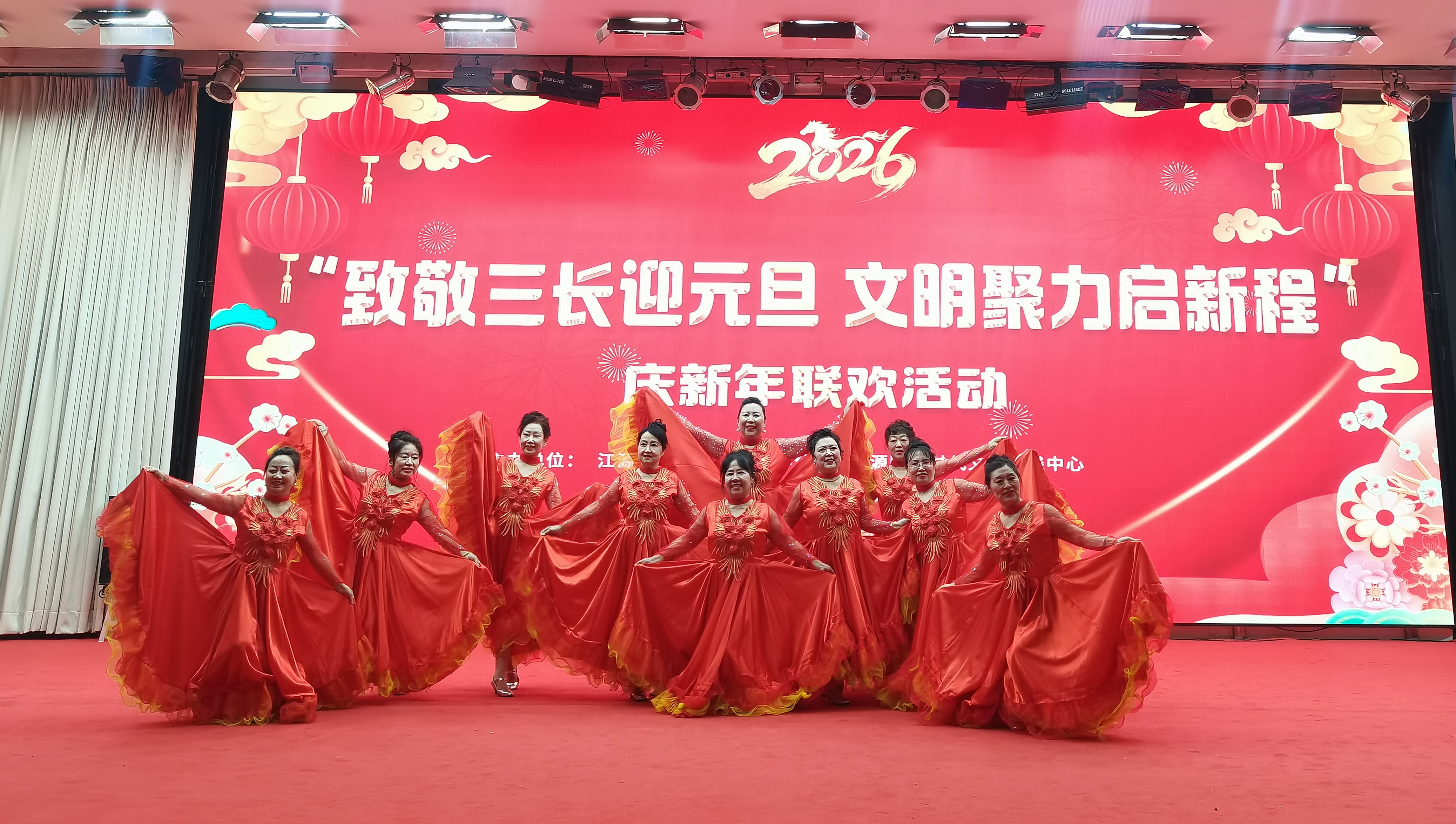 為深切致敬基層治理一線的中堅力量,進一步凝聚全區上下文明向善的強大合力,營造歡樂祥和的節日氛圍,近日,由白山市江源區精神文明建設辦公室、江源區新時代文明實踐中心主辦的“致敬‘三長’迎元旦 文明聚力啟新程”慶新年聯歡文明惠民活動在青少年宮禮堂溫情啟幕。社區黨員代表、“三長”(網格長、樓棟長、單元長)代表、文藝志愿者及轄區熱心居民齊聚一堂,載歌載舞共慶元旦佳節,共話家園發展新愿景。 活動現場暖意融融,鮮艷的氣球與喜慶的燈籠點綴其間,空氣中洋溢著濃厚的節日氣息。伴隨著歡快激昂的旋律,開場舞《福門開好運來》率先登場,舞者們身著艷麗服飾,邁著輕快的舞步,用靈動的舞姿傳遞出對新年的美好期盼,瞬間點燃了現場的熱烈氛圍,正式拉開了“全民聯歡”的序幕。