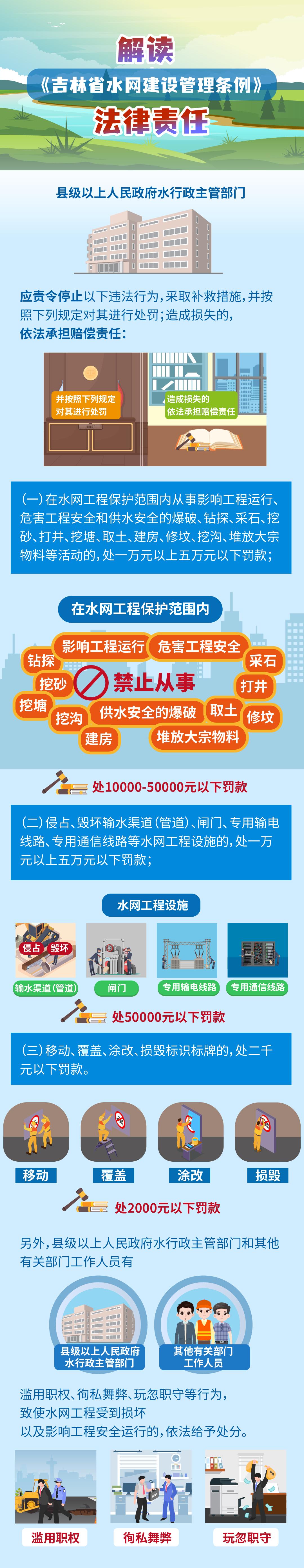 縣級(jí)以上人民政府水行政主管部門應(yīng)責(zé)令停止以下違法行為,采取補(bǔ)救措施,并按照下列規(guī)定對(duì)其進(jìn)行處罰;造成損失的,依法承擔(dān)賠償責(zé)任: (一)在水網(wǎng)工程保護(hù)范圍內(nèi)從事影響工程運(yùn)行、危害工程安全和供水安全的爆破、鉆探、采石、挖砂、打井、挖塘、取土、建房、修墳、挖溝、堆放大宗物料等活動(dòng)的,處一萬元以上五萬元以下罰款; (二)侵占、毀壞輸水渠道(管道)、閘門、專用輸電線路、專用通信線路等水網(wǎng)工程設(shè)施的,處一萬元以上五萬元以下罰款; (三)移動(dòng)、覆蓋、涂改、損毀標(biāo)識(shí)標(biāo)牌的,處二千元以下罰款。 另外,縣級(jí)以上人民政府水行政主管部門和其他有關(guān)部門工作人員有濫用職權(quán)、徇私舞弊、玩忽職守等行為,致使水網(wǎng)工程受到損壞以及影響工程安全運(yùn)行的,依法給予處分。