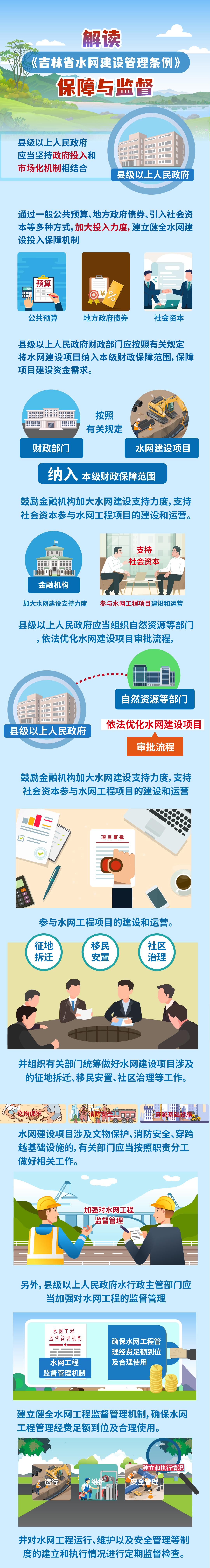 縣級以上人民政府應當堅持政府投入和市場化機制相結合,通過一般公共預算、地方政府債券、引入社會資本等多種方式,加大投入力度,建立健全水網建設投入保障機制。縣級以上人民政府財政部門應按照有關規定將水網建設項目納入本級財政保障范圍,保障項目建設資金需求。鼓勵金融機構加大水網建設支持力度,支持社會資本參與水網工程項目的建設和運營。 縣級以上人民政府應當組織自然資源等部門,依法優化水網建設項目審批流程,提高用地審批效率。并組織有關部門統籌做好水網建設項目涉及的征地拆遷、移民安置、社區治理等工作。水網建設項目涉及文物保護、消防安全、穿跨越基礎設施的,有關部門應當按照職責分工做好相關工作。 另外,縣級以上人民政府水行政主管部門應當加強對水網工程的監督管理,建立健全水網工程監督管理機制,確保水網工程管理經費足額到位及合理使用。并對水網工程運行、維護以及安全管理等制度的建立和執行情況進行定期監督檢查。