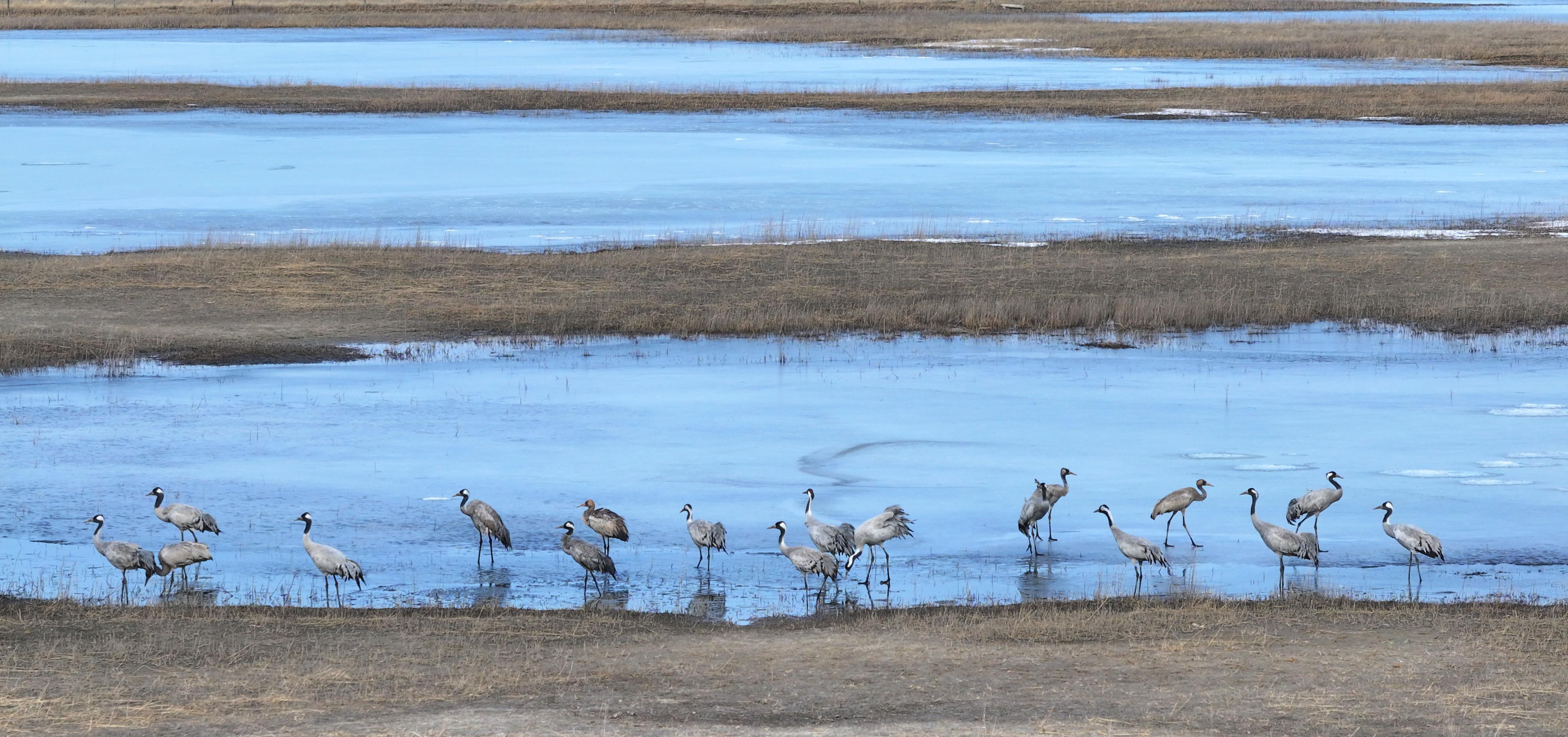三月的春風掠過吉林白城黑土地,鎮賚縣二龍濤河流域奏響生命交響——3月12日,2只國家一級保護動物白鶴攜200余只灰鶴、豆雁等珍禽翩然而至,在泛著碎冰的淺灘上梳羽覓食,時不時在濕地上空舒展翅膀、歡快鳴叫,東方白鸛也在鶴群上空現身,拉開全球最大白鶴種群春季停歇的序幕。作為候鳥遷徙通道的"黃金中繼站",這片濕地正以五星級生態服務迎接跨越萬里的"天空舞者"。 鎮賚縣不僅是全球最大的白鶴種群遷徙停歇地,也是國內公認的最佳白鶴觀測地之一。監測數據顯示,當地每年春秋兩季在這里停歇的白鶴超過4000只,白頭鶴超過1800只,灰鶴數量超過5000只,東方白鸛最高停歇記錄超過2000只,而此次鶴群的“先遣”抵達,預示著以白鶴、東方白鸛為代表的大批珍稀候鳥即將接踵而至。