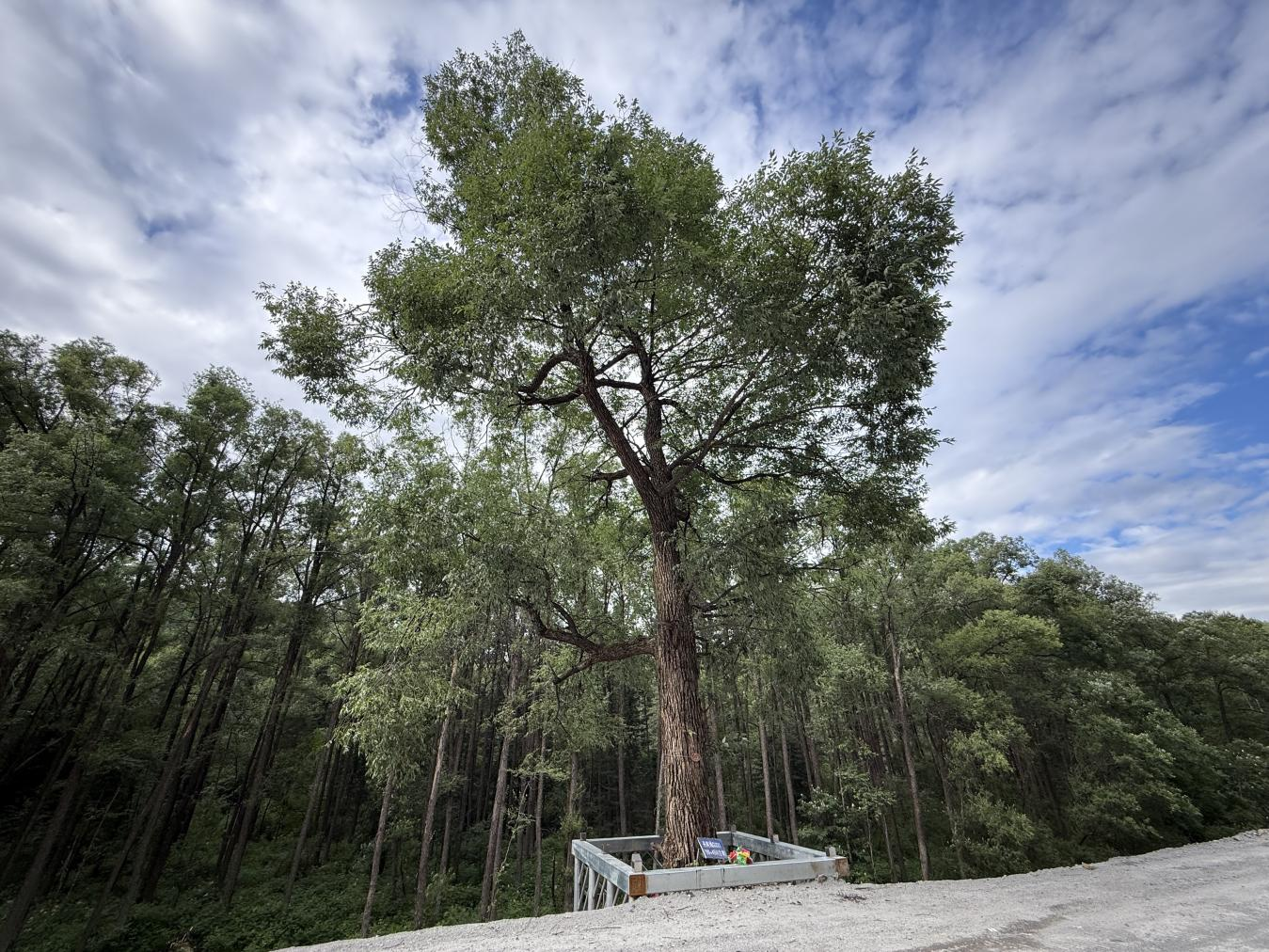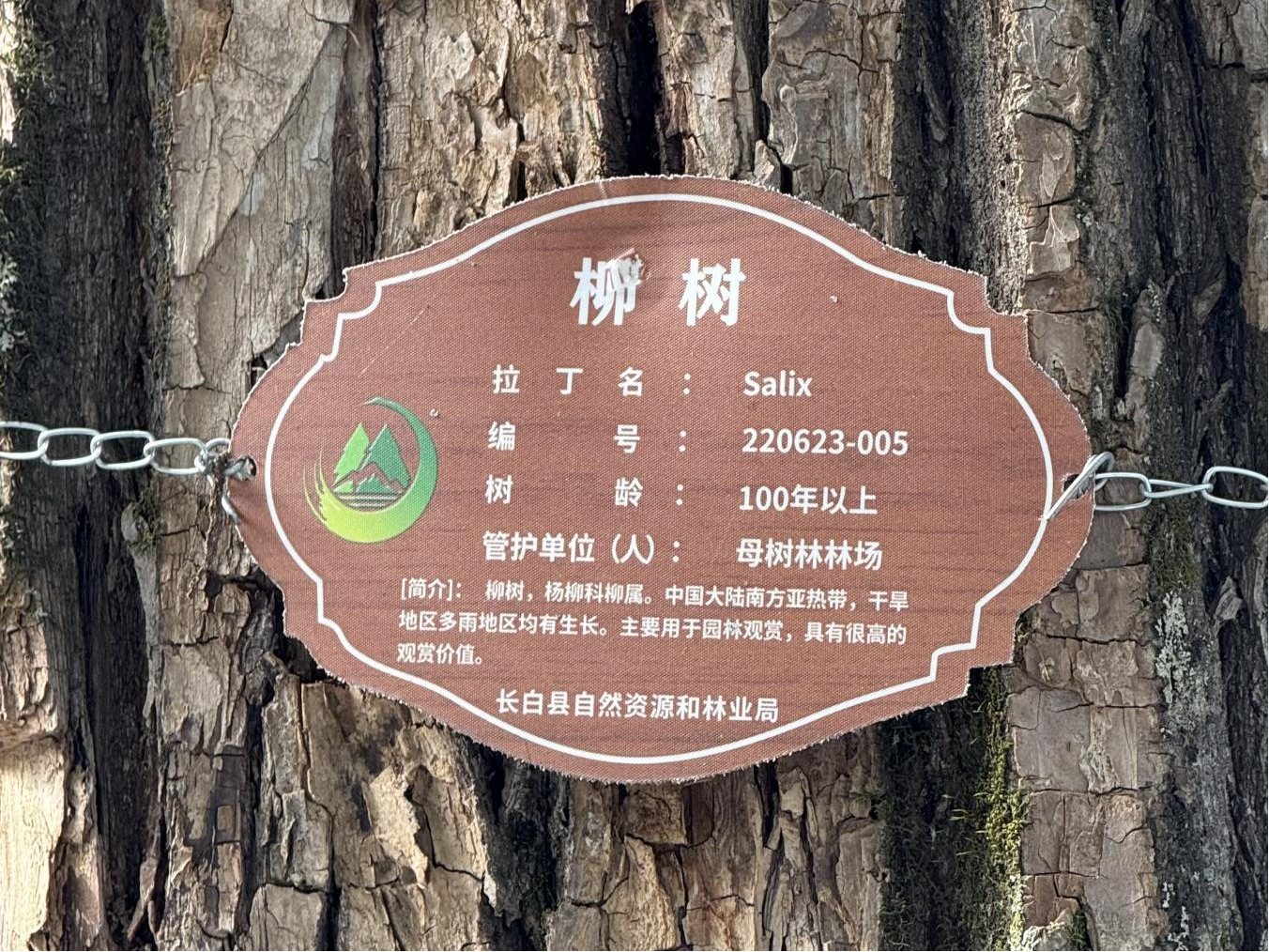 在G331無人區的790里程碑旁,一棵編號為“220623—005”的百年柳樹靜靜矗立。這株由長白縣自然資源和林業局認定、母樹林林場具體管護的古樹,以其逾百年的樹齡,成為鴨綠江上游一道獨特的生態景觀。 穿過樹下的方形圍欄,駐足凝視這棵飽經風霜的柳樹,粗糙的樹皮上鐫刻著歲月的痕跡,蒼勁的枝干訴說著百年光陰的故事。養護責任人告訴我們,在北方地區能存活如此之久的柳樹實屬罕見,這主要得益于長白縣得天獨厚的自然環境。“這里背風向陽,地下水位穩定,加上火山巖土壤富含礦物質,為它提供了理想的生長條件。”更難得的是,長白縣按照上級要求實施的“一樹一標識”保護措施,定期為古柳進行病蟲害防治和營養補充,讓這棵見證了百年滄桑的老樹得以繼續守護這片土地。微風拂過,垂落的柳枝輕輕搖曳,仿佛在向我們展示它跨越世紀的堅韌生命力。